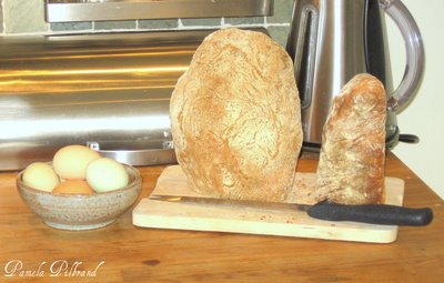 Hembakade bröd utan konserveringsmedel kan ju inte ligga framme i två veckor, och det är väl skönt att slippa sådana bröd nu. Men de håller sin fint i två dagar och en limpa blir en vacker dekoration i köket då man inte behöver plasta in det under en sådan kort tid. Man ställer det helt enkelt rakt upp och ner med den skurna sidan nedåt på en skärbräda. Och vips så har man ett vackert stilleben också..! :)